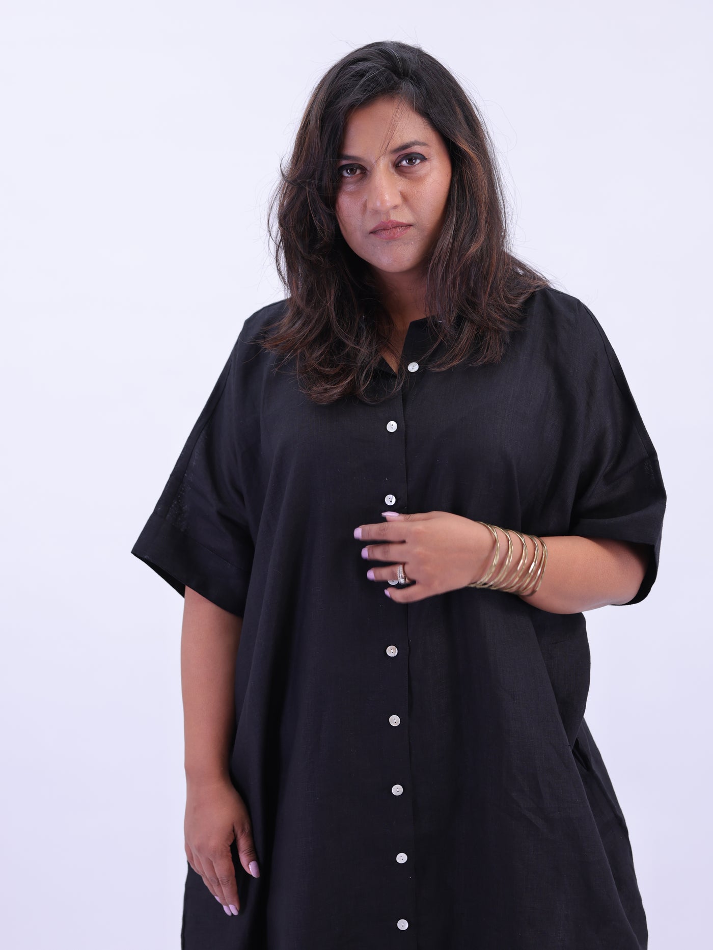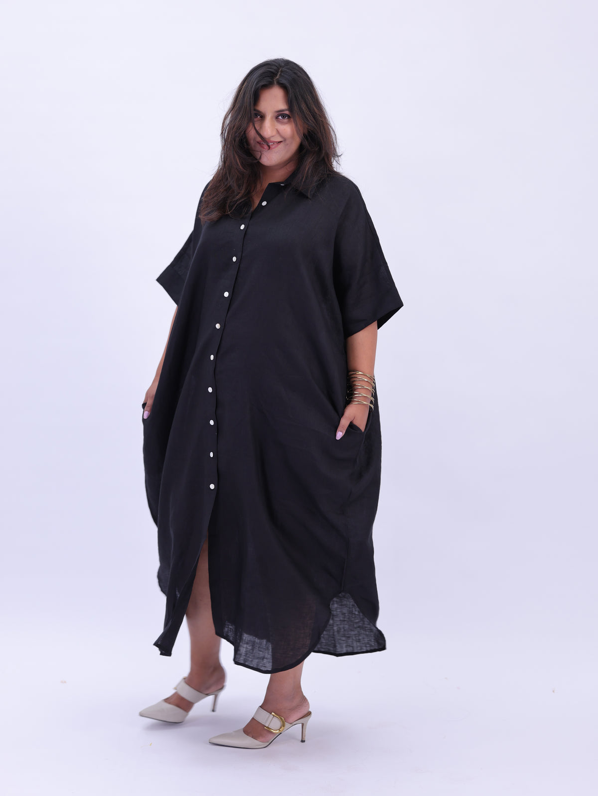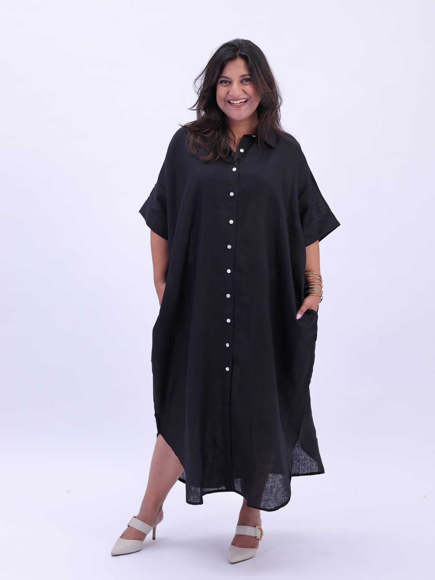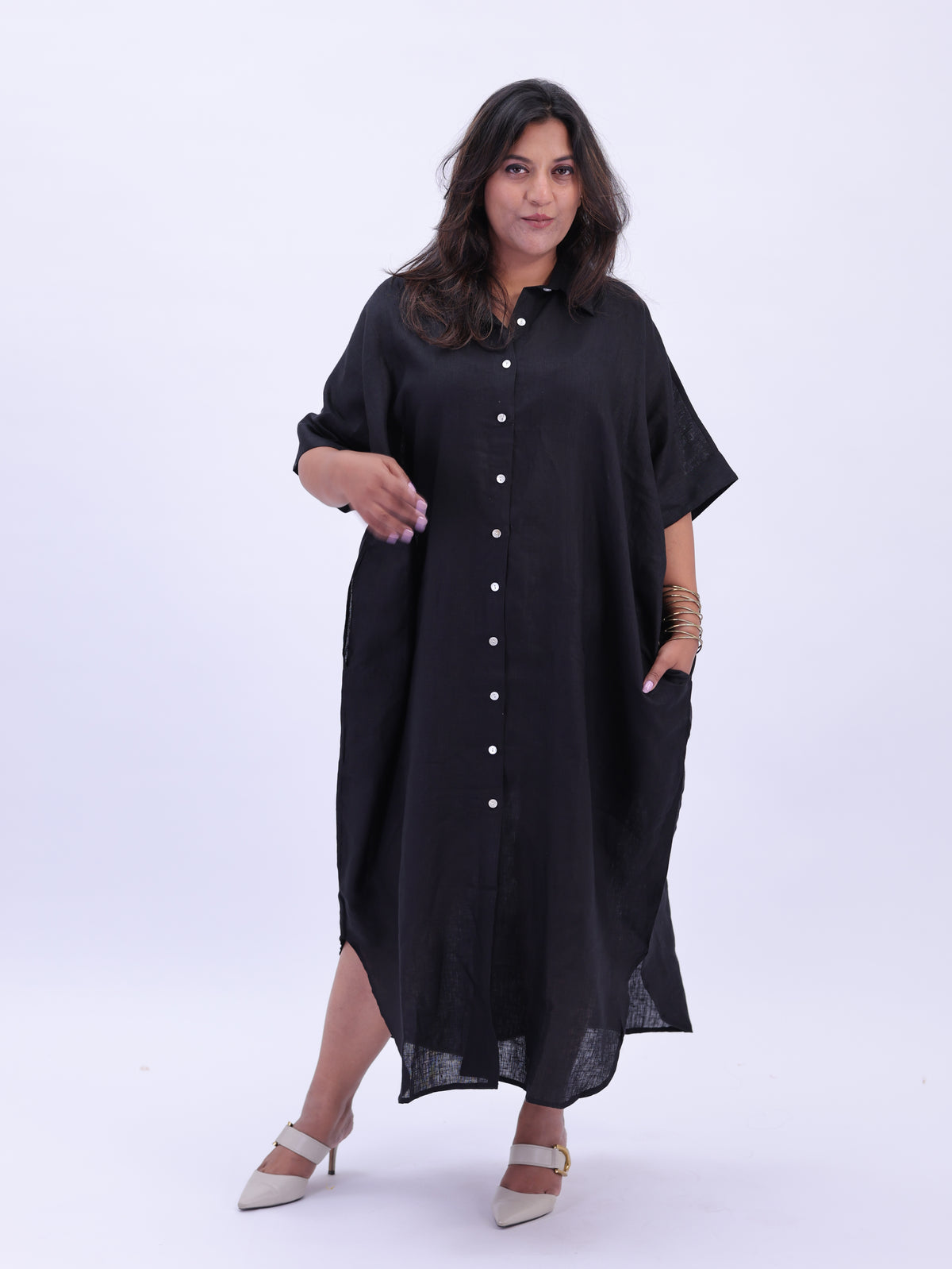 Samah Shirt Style Pure Linen Dress - Black